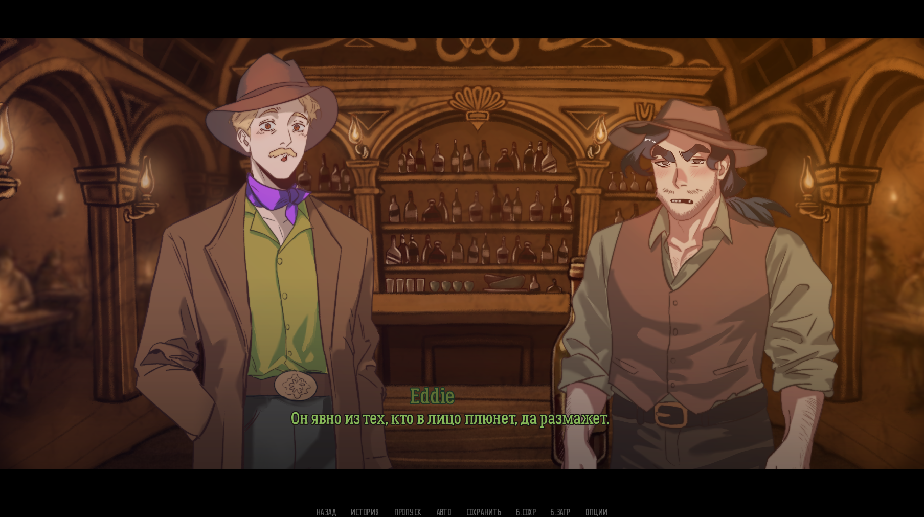 Очень интересная, визуально красивая новелла. Юмор отпад, супер живые персонажи. Со взаимодействий Эдди и Леи ваще хихикала, как и с шуток Ламберта. Сюжет классно катает на эмоциональных качелях и ни на секунду не заставляет заскучать. Персонажи мастерски вплетены в ковбойский сеттинг и тема лиминального особняка здорово его освежает. С нетерпением буду ждать полную версию!